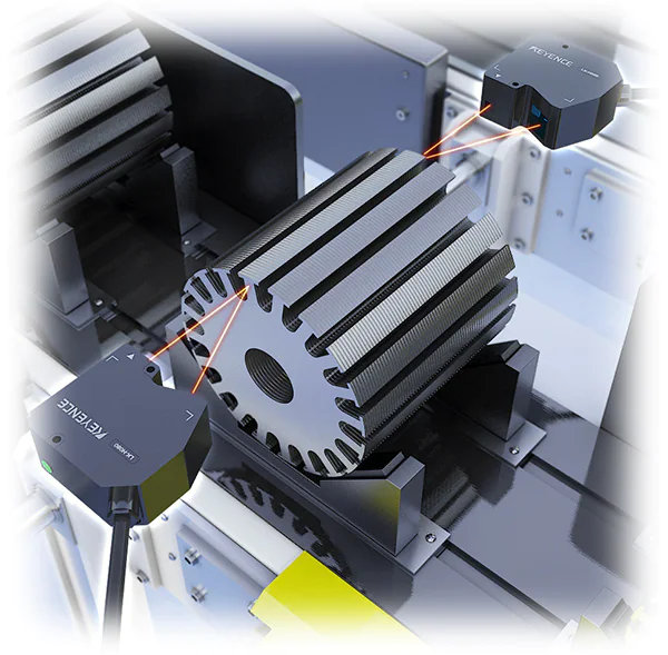 对于叠层电机铁芯,设备性能的变化取决于叠层的数量。由于这个原因,我们首先直观地检查是否已经设置了指定的核心层数量。通过使用KEYENCE的LK系列激光位移传感器进行在线厚度测量,我们能够自动检测我们的产品。