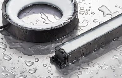 Environmentally resistant lights are available in bar and ring types. Combine them with an environmentally resistant camera and lens for safe use in environments that are exposed to powder, dust, dripping, and splashing.